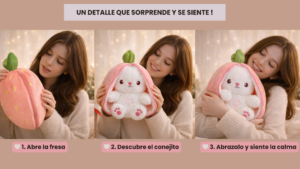 Este conejito con función de reducción de ansiedad, alivio del estrés y ayuda para dormir es un detalle especial para niños y mujeres que buscan confort. Su transformación en fresa lo hace aún más único y encantador.